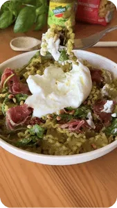 Mélanger les Mafaldelle avec le pesto crémeux. Ajouter les tomates séchées, la roquette. Rajouter au-dessus une belle boule de burrata, le jambon cru, les pignons de pin torréfiés.